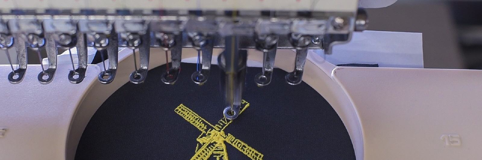 Ein weiterer Aspekt für ein hochwertiges Endprodukt ist die Nutzung industrieller Stickmaschinen. Hier spielen Garne, Nadeln, Stickvliese und abgestimmte Maschinen eine grosse Rolle. Ober- und Unterfadenspannung sind für ein sauberes Stickbild entscheidend. Die grosse Auswahl an Garnfarben ermöglicht die Darstellung verschiedenster Pantone- oder HKS-Töne. Durch die Nutzung von dünnen Garnen lassen sich selbst Schriften mit einer Maximalhöhe von 6 mm noch herausarbeiten.
